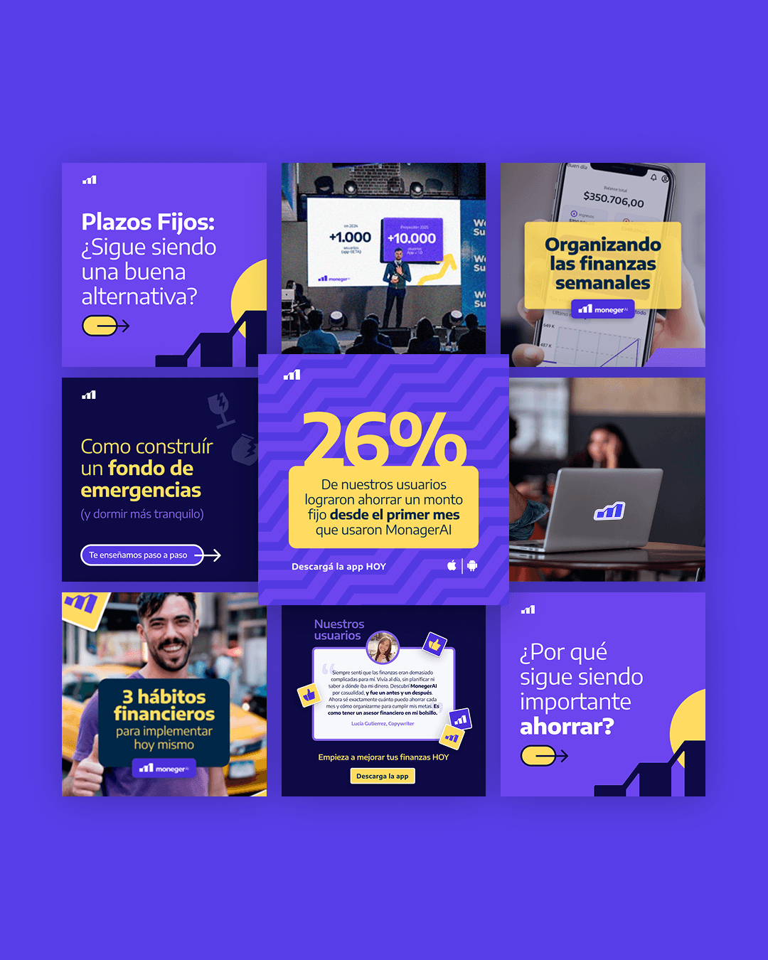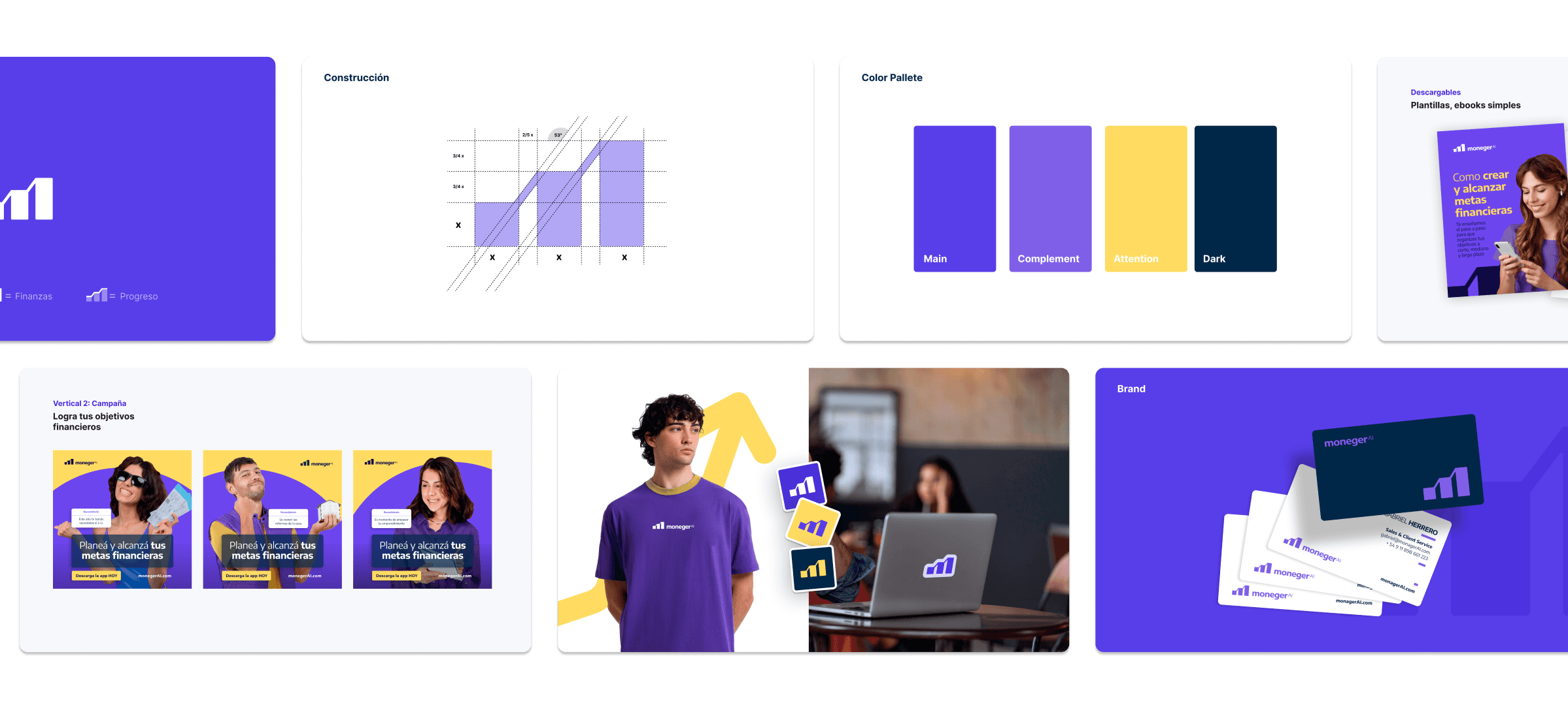 The identity is built around a simple idea: progress you can see. The “m” in Monager transforms into a growing bar chart — a universal symbol of financial improvement, directly linking the brand to its purpose.